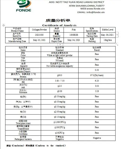 Порошок из чистого коллагена, также называемый гидролизованный желатин, изготовлен из свежей воловьей кожи преображения и биоразложения коллагена с биологическим энзимом, для формирования микромолекулярного коллагена полипептида со средней молекулярной массой менее 3000. Инсен рыбий коллагент содержит полную аминокислоту и имеет преимущества хорошей питательной ценности, высокой абсорбции, растворимости в воде, дисперсионной стабильности и качества влажного удержания.