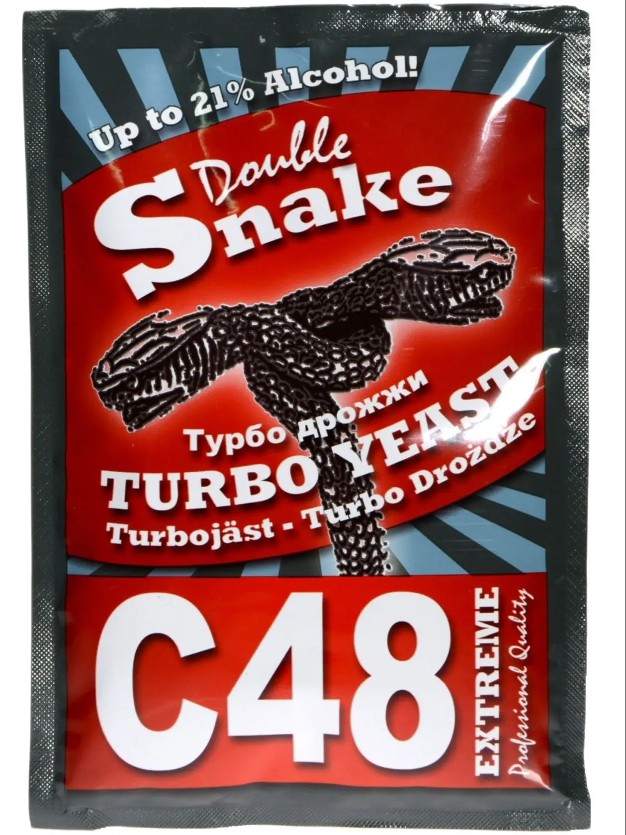 Спиртовые Турбо дрожжи Double Snake Turbo Yeast C 48 Turbo 130 гр являются самыми быстрыми турбодрожжами. Турбо дрожжи C48 для самогона и спирта ректификата способны сбродить 6 кг сахара за 48 часов до 14%, с минимальным количеством сивушных масел. Одна пачка рассчитана на 25 литров затора в соотношении от 6 до 9 кг сахара или декстрозы. Время брожения составляет примерно от 2 до 10 дней в зависимости от количества сахара, при этом содержание спирта может доходить до 21% об.