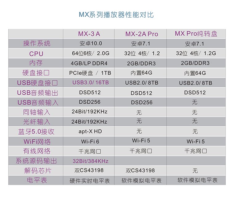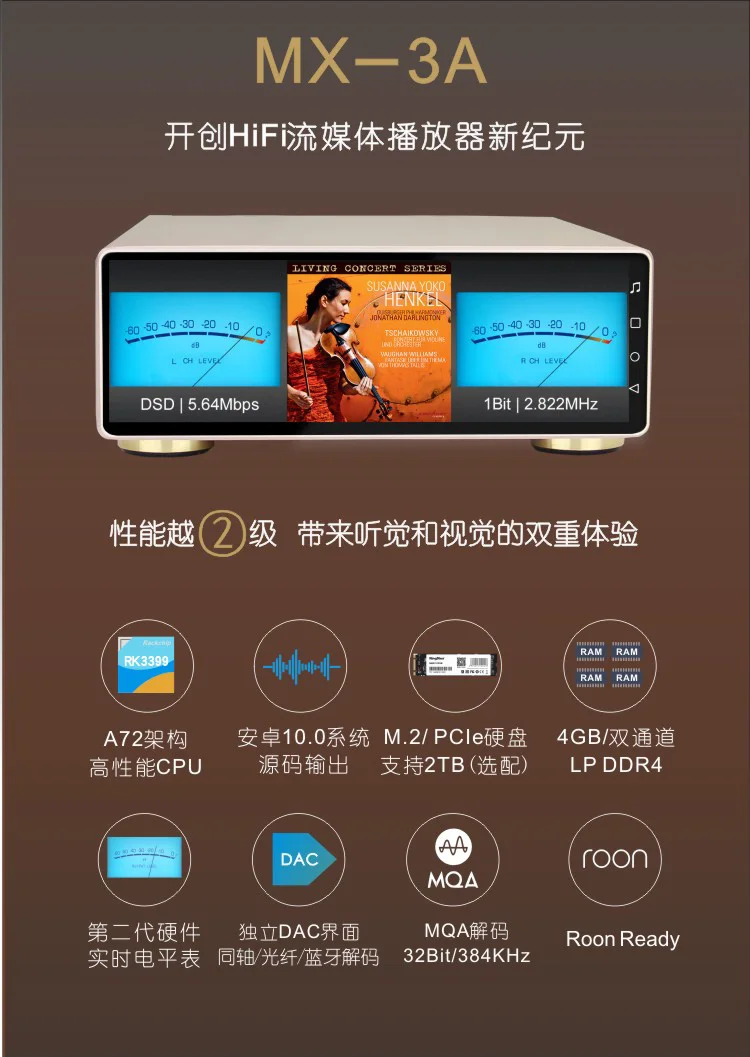 Аппаратная платформа MX-3A использует жесткий диск RK3399 + 4 Гб/LP DDR4 + M.2 /SSD + беспроводную сетевую карту Wi-Fi 6, И обладает мощной производительностью обработки на уровне ПК по каналу передачи ЦП-памяти-жесткого диска-сети, чтобы гарантировать самую низкую задержку сигнала каждой аппаратной связи, И производительность оборудования на 2-3 уровня выше, чем у 30000-30000 игроков на рынке, А Система Android обновлена до последней версии 10,0. В то же время система Android поддерживает вывод исходного кода, что позволяет плеерам Hi-Fi получить ощущение полета.