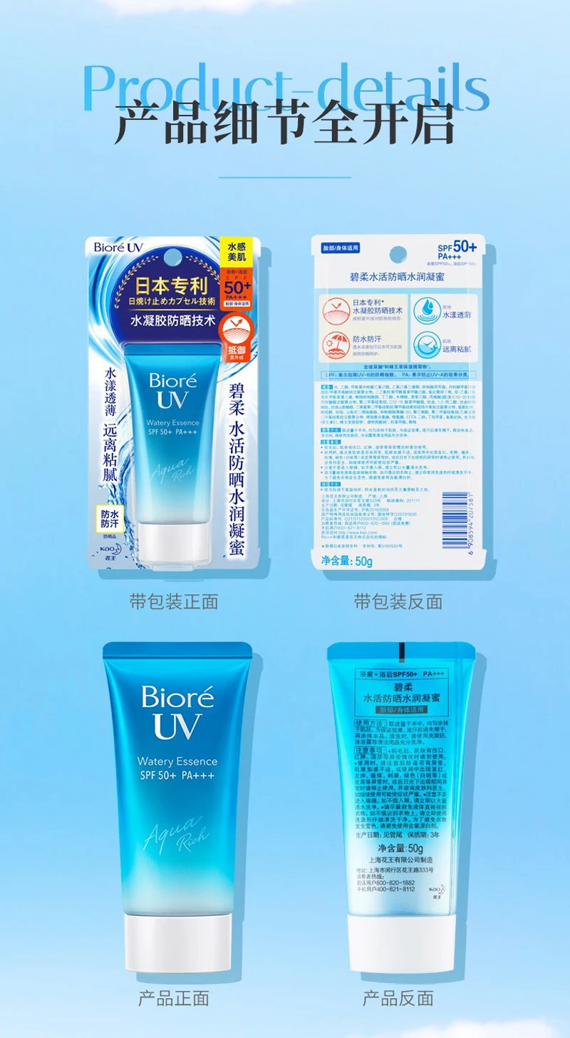 Bioré UV Aqua богатый водный гель, жидкий экстракт с прозрачным ощущением, который легко сочетается с кожей, и Bioré UV Aqua богатый водный гель, водный гель, который плавно распределяется по всему телу.