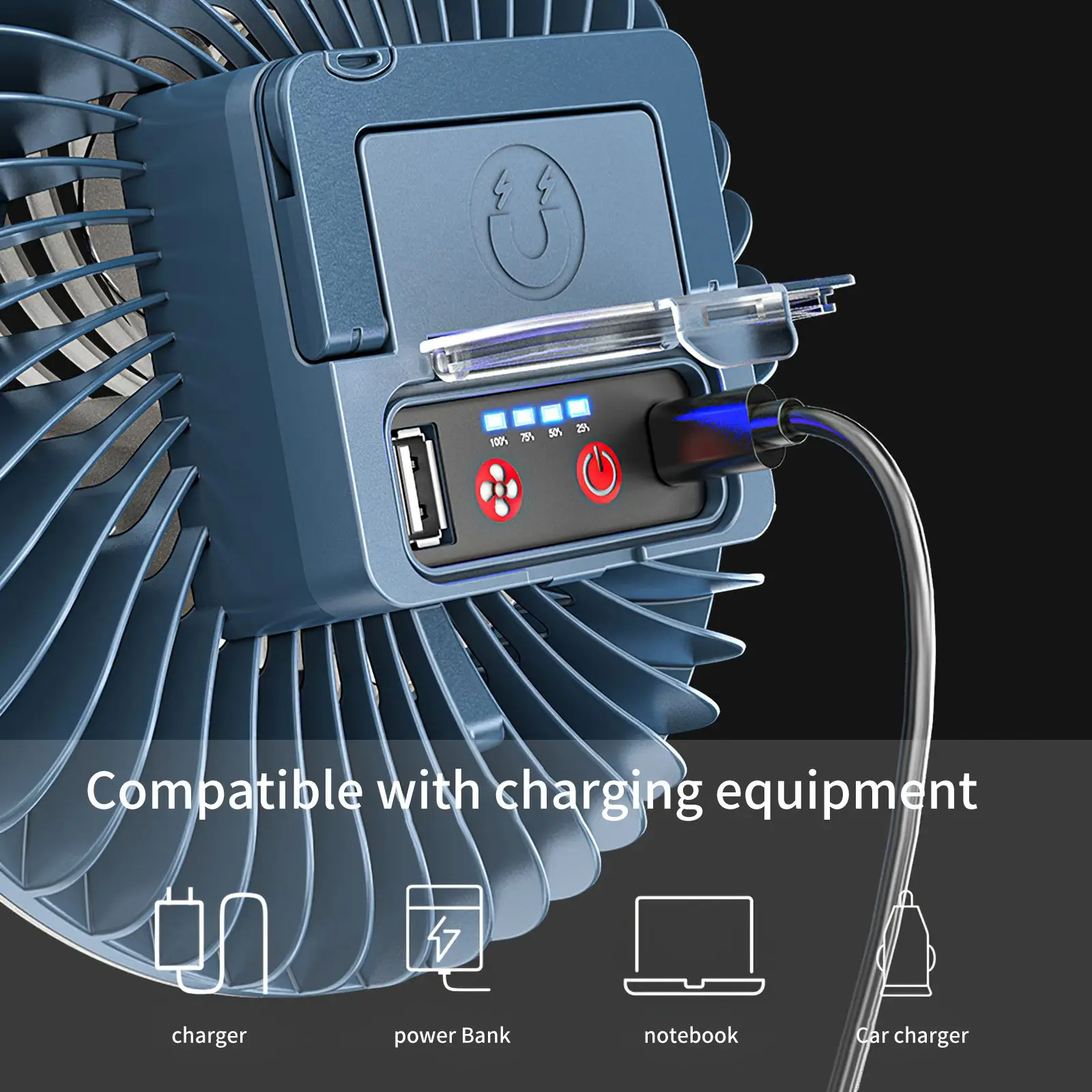 Вентилятор для палатки заряжается через USB. Вы можете подключить компьютер или мобильный банк питания для зарядки. Кроме того, его можно использовать в качестве аварийного питания. Когда ваш телефон выключен на открытом воздухе, вы можете использовать его для зарядки телефона.