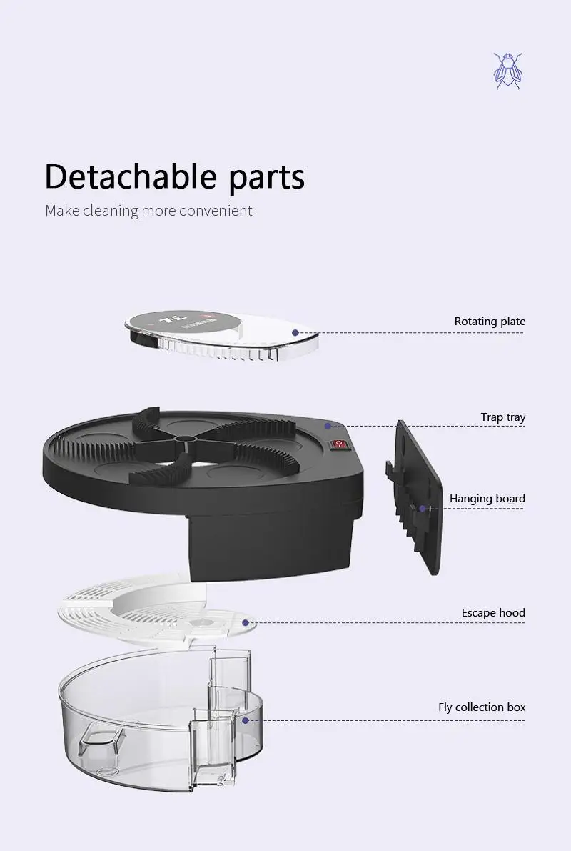 -- Мульти-сетка приманки слот дизайн, 360 ° вращающийся всенаправленный метод ловли. Прозрачная вращающаяся пластина сотрудничает с системой защиты от побега, так что мухи не могут выйти после входа.