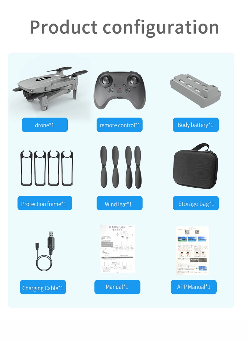 Самолет * 1, пульт дистанционного управления * 1, запасной вентилятор * 4, защитная рамка * 4, держатель мобильного телефона * 1, USB кабель для зарядки * 1, руководство * 1