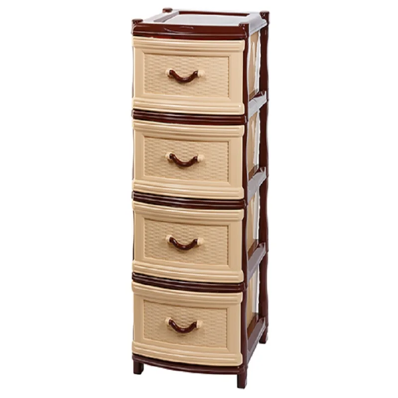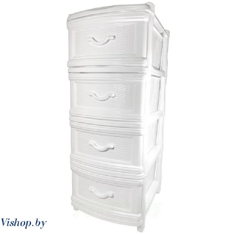 Комод из пищевого пластика с четырьмя выдвижными ящиками предназначен для хранения вещей и продуктов питания и гармонично впишется в интерьер любой комнаты. Легкий и вместительный комод поможет обеспечить порядок, избавит от разбросанных игрушек или одежды, убережет продукты от пыли и заветривания. Узор на передних панелях придаст индивидуальность и подарит настроение.