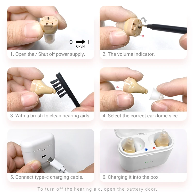 Посылка включает слуховой аппарат, usb-кабель, портативную зарядную коробку, 6 беруши для ушей, чистящую щетку, защиту от воска, руководство по использованию.