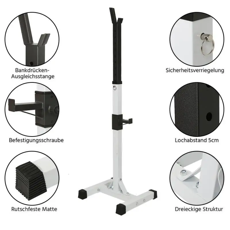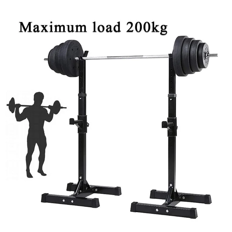 2. Это сверхпрочная стандартная стальная стойка для приседания, которая может использоваться для размещения штанги, выполнения различных упражнений, таких как тяжелая атлетика и приседания, а также использования отжиманий и упражнений на плечах.
