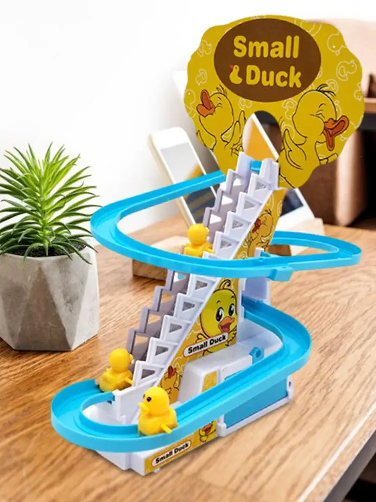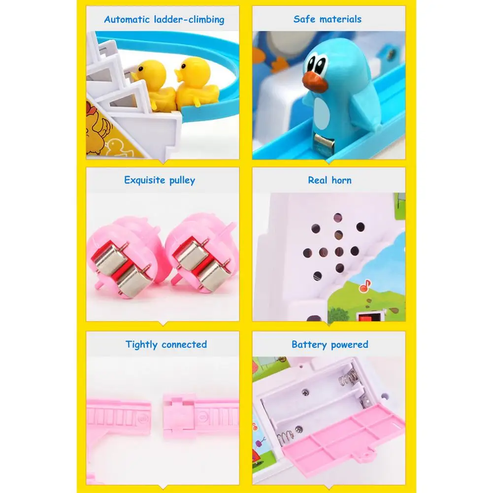 3 、 Уникальный дизайн: набор игрушек поставляется с мигающий светодиодный свет, и он легко собирается. Милые маленькие желтые утки могут лазить по ступенькам и скользить по дорожкам. Игрушка содержит интересные треки и веселую музыку (с кнопкой вкл/выкл).
