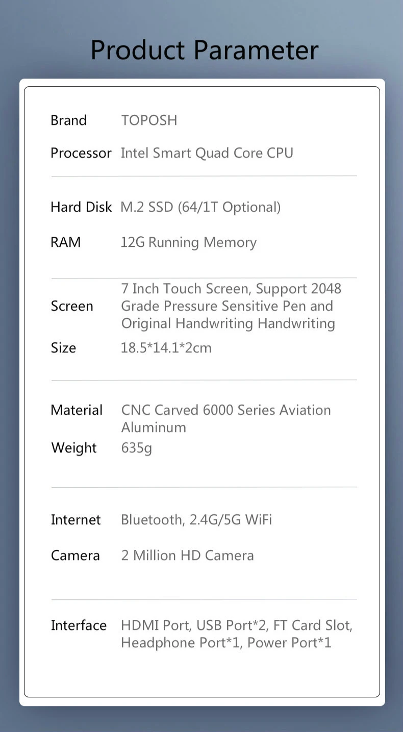 Диагональю 7 дюймов Полностью алюминиевый металлический корпус как светильник как 635 гр. Его можно взять одной рукой в любое время или положить в небольшую сумку, даже в карман пальто.