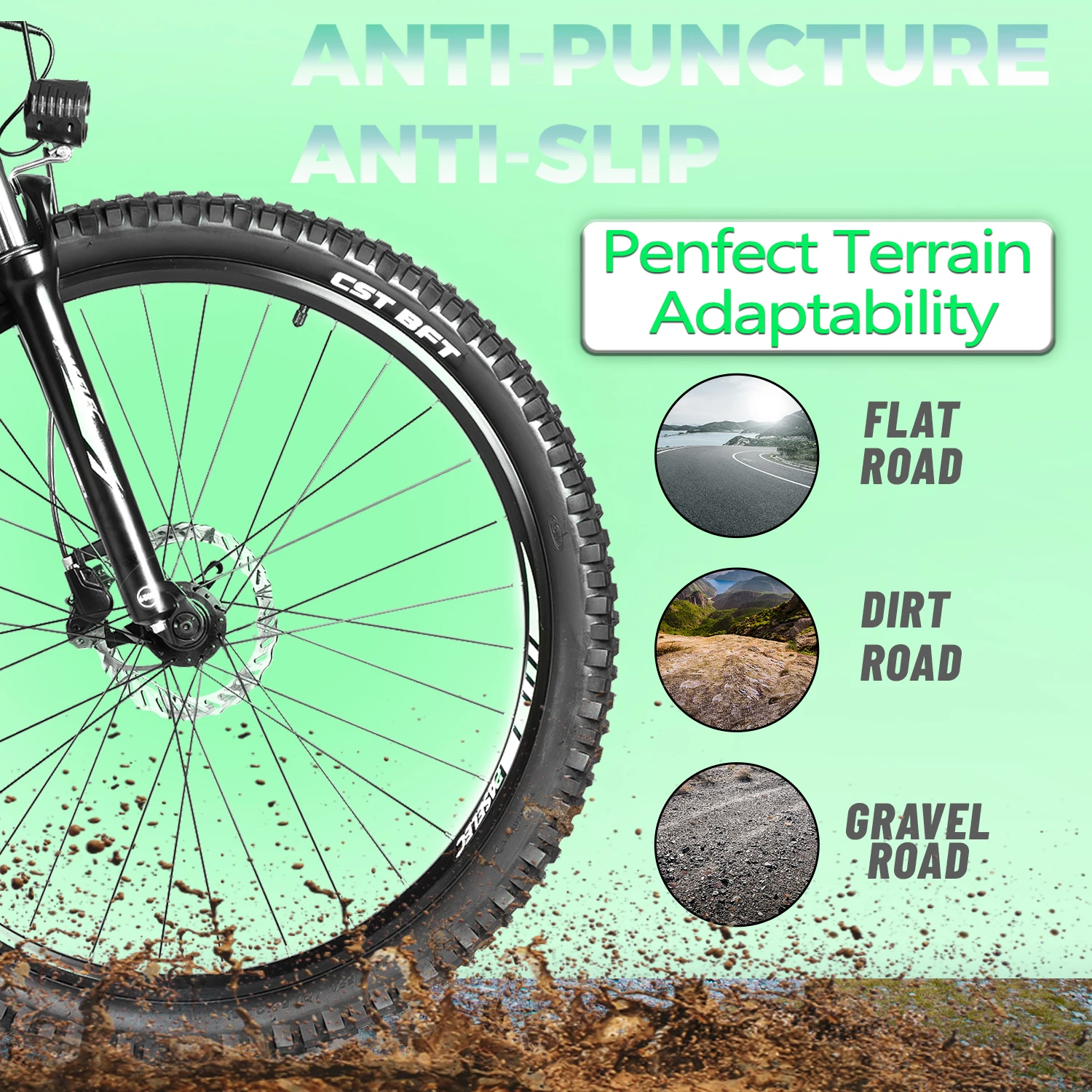 Усовершенствованная компактная конструкция-сопоставима с непревзойденным комфортом и адаптируемостью профессиональных горных велосипедов. Оснащен 27,5 дюймов * 2,4 ''анти-скольжение колес, а также улучшенной четырехклинка Алюминий оправа из сплава, подтверждая блокировку и задние AIRE седло подвеска (F: 100 мм R: 40 мм) Пройдите гладко даже на сложных и ухабистых дорогах. Невероятные горные приключения и езда по городу.