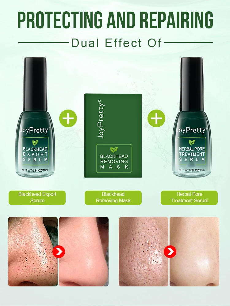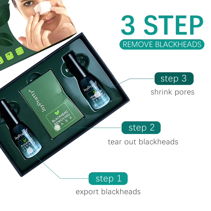 Набор для удаления черных трав включает в себя экспортную сыворотку черных точек, маску для удаления черных точек и травяную сыворотку для лечения пор. Наша продукция содержит несколько растительных эссенций, таких как экстракт хамамелиса Вирджинии, экстракт цветов Беллис перенниса, экстракт листьев камелии Синенсис и так далее, которые могут аккуратно удалять черные точки и поры, но не повредить вашу кожу. Подходит для всех типов кожи. Специально разработанная головка щетки удобна и гигиенична для вас. После использования кожа вашего носа станет гладкой и нежной.