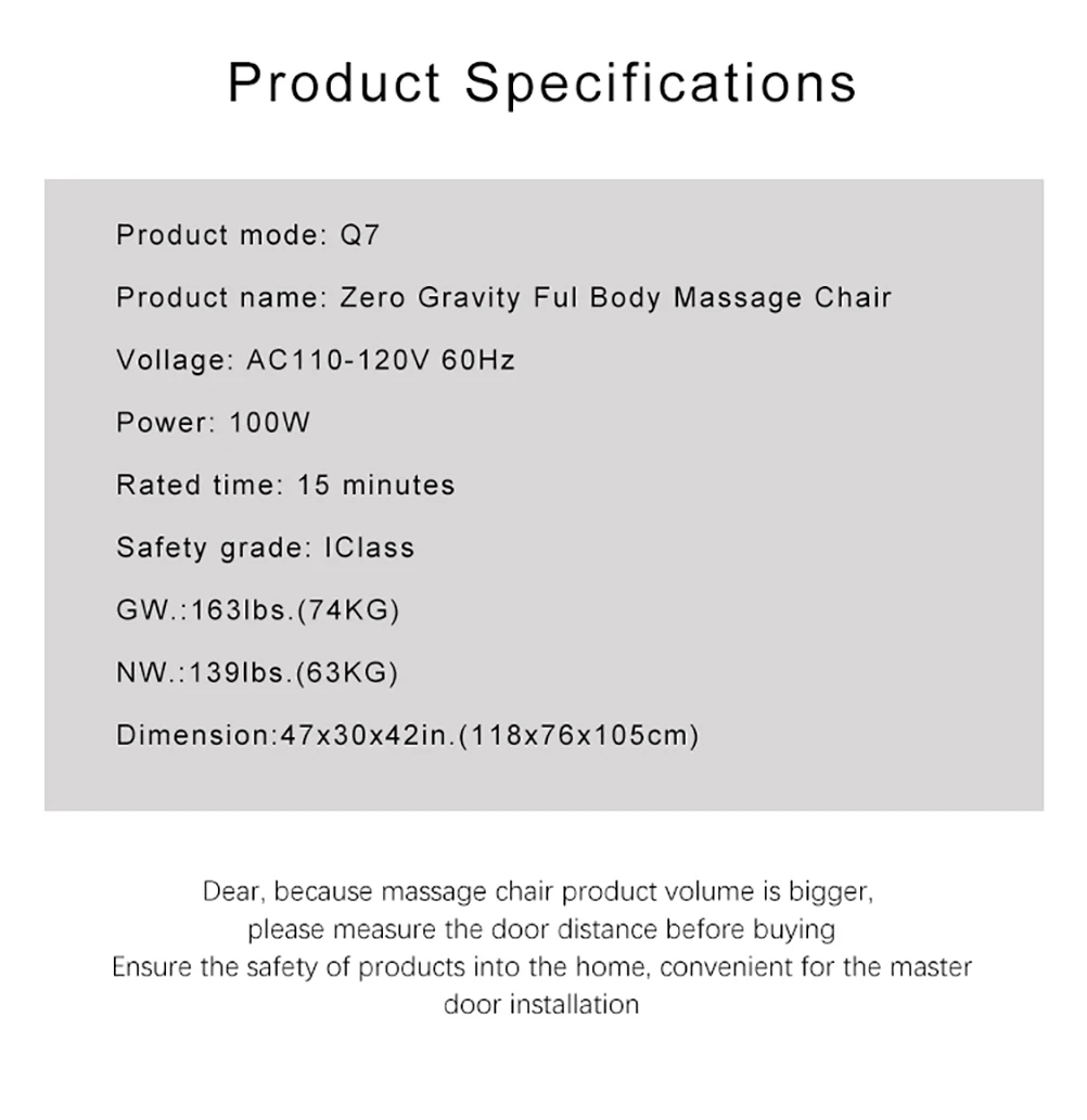 Уважаемый, поскольку объем массажного кресла больше, пожалуйста, Измерьте расстояние двери перед покупкой, чтобы обеспечить безопасность продуктов в доме, удобно для установки главной двери