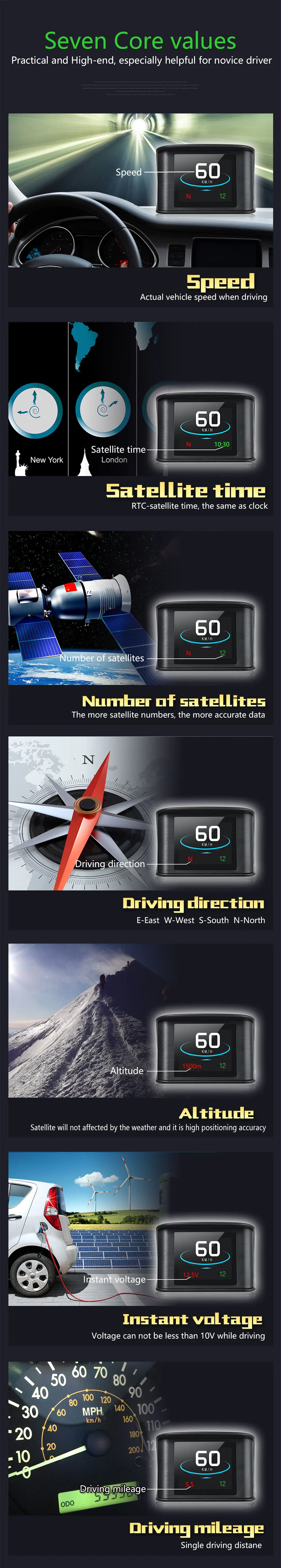 • Богатое содержание: реальное время спутникового GPS, компас, высота, напряжение автомобильного аккумулятора, пройденное расстояние и т. Д.