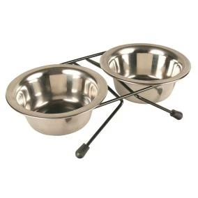 Подставка с мисками - очень удобная посуда для кормления животного. Одну миску можно наполнить кормом, другую - питьевой водой. Миски не стоят на полу, а находятся в подвешенном состоянии. Емкости одного размера, выполнены из нержавеющей стали. Подставка металлическая с чёрным напылением. Для удобства питомца у изделия предусмотрены нескользящие ножки.