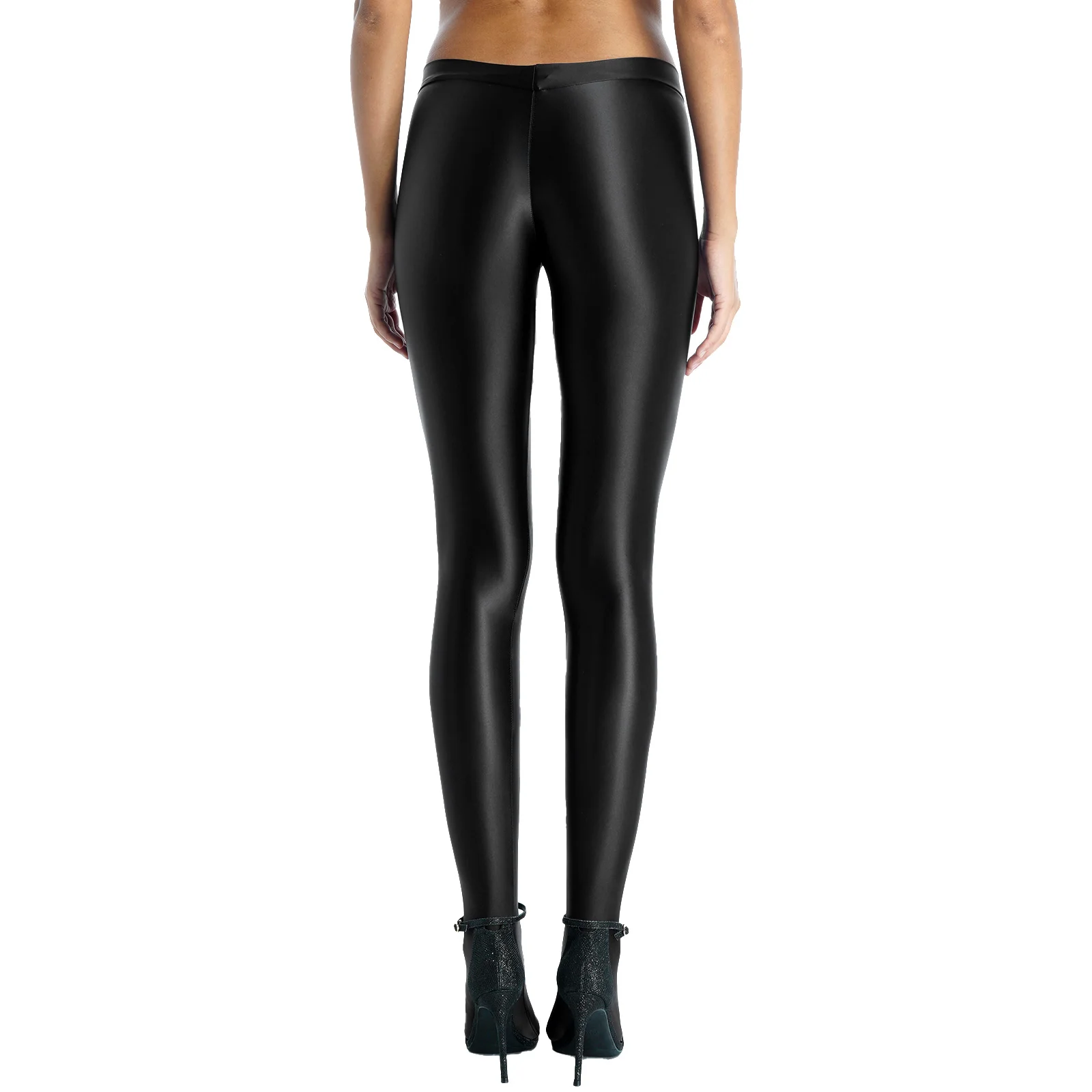 С глянцевым внешним видом, средней талией, застежкой-молнией через промежность.