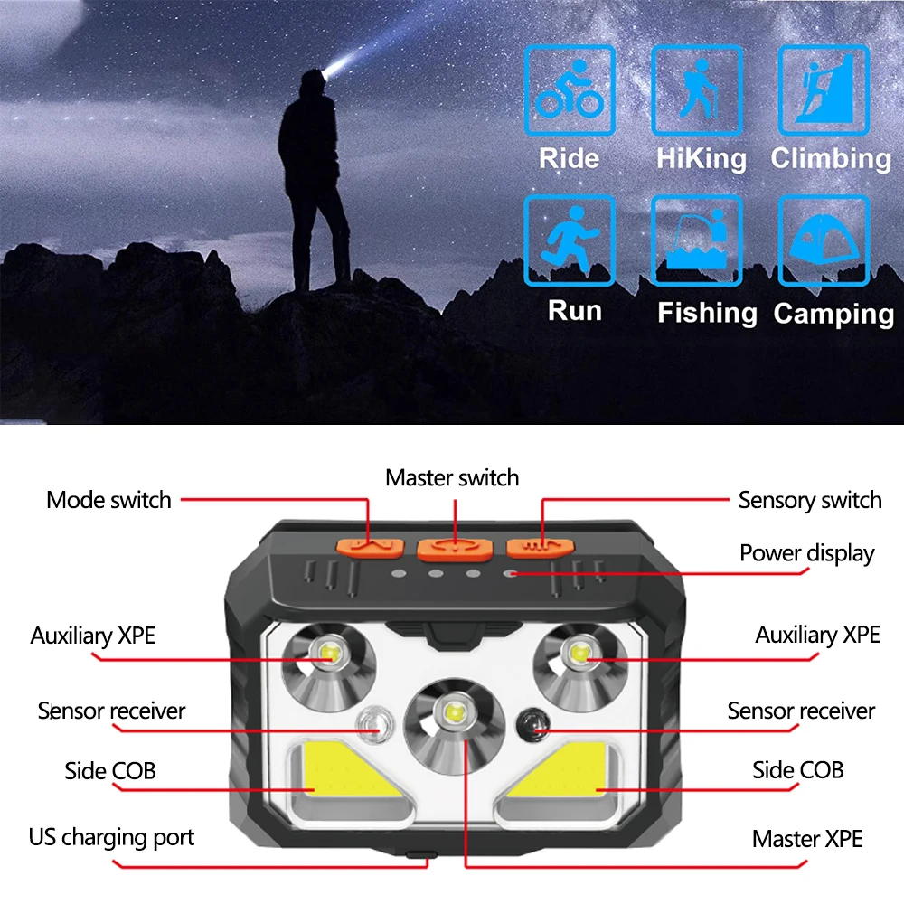 Портативный наружный indnctive светильник предназначен для всех-перспективно, USB порт зарядки добавляет более сильную мощность на нем. Основной светодиодный светильник. Специальная конструкция с двойным переключателем для преобразования режимов. Перезаряжаемая батарея высокой емкости обеспечивает длительное питание для более безопасных видов спорта на открытом воздухе. Налобный фонарь в основном используется для рыбалки, охоты, ночного бега, походов и кемпинга.