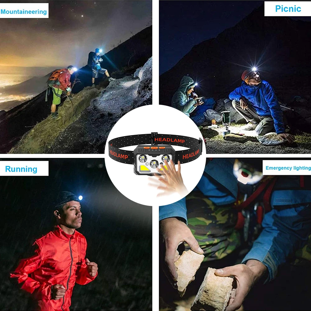Мощный светодиодный светильник на голову с датчиком, светильник на голову, USB Перезаряжаемый налобный фонарь, водонепроницаемый, для кемпинга, пешего туризма