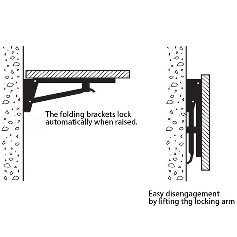 Bracket Spec - Bracket Supports Max. Load 150 lbs ( 75 KG Heavy Duty), includes LONG Release Arm for ease of use - Triangle-shape is the sturdiest construction in wall brackets currently. Enough to be used as Bookshelf, Kitchen shelf, Exhibition Stand, Garden Shelf, External Wall Brackets etc. Heavy Duty Stainless Steel Folding Shelf Brackets are perfect for your garage style.