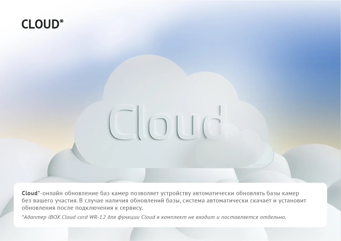 Для использования сервиса Cloud требуется адаптер iBOX Cloud cord WR-12 и SIM-карта любого оператора. Адаптер iBOX Cloud cord WR-12 и SIM карта для сервиса Cloud в комплект не входят. Адаптер iBOX Cloud cord WR-12 поставляется отдельно.