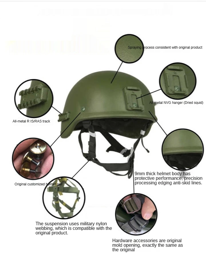 Данный продукт изготовлен из импортного полимерного АБС-материала толщиной 9 мм. Полный шлем весит около 1350 г (включая подвеску), что в основном соответствует весу оригинального кевларового шлема, чтобы удовлетворить требования к тренировкам по имитации веса при ношении. Кроме того, в отличие от обычных шлемов 5-6 мм на рынке, толстые шлемы 9 мм обеспечивают защиту от обычных шлемов