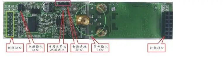 Входной интерфейс аналогового сигнала имеет две формы, один-контактный интерфейс, другой-интерфейс SMA (рекомендуется входной сигнал интерфейса SMA), И интерфейс передачи данных использует 14PIN 2,54 интервал между сиденьями шины. Интерфейс модуля показан как показано на следующей схеме.