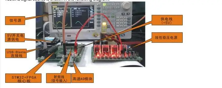 Тестирование высокоскоростного AD модуля требует использования контроллера преобразования AD (обычно с использованием FPGA), линейного регулятора напряжения (пульсации) и источника сигнала + 5 В. Схема тестового подключения с использованием линейного стабильного модуля питания в магазине, C8051F/STM32 + FPGA основная плата и источник сигнала 160 МГц показаны на следующей схеме.