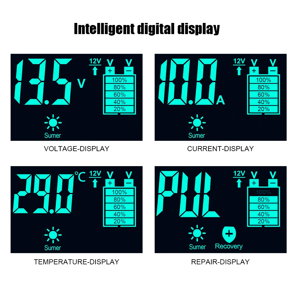 Большой ЖК-дисплей состояние зарядки и аккумулятора; Напряжение зарядки и ток, внутренняя температура, процент заряда, летний режим, зимний режим и т. д. более удобно в использовании.