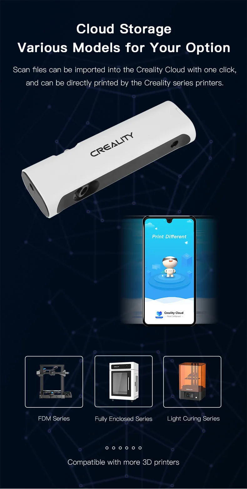 Файлы сканирования могут быть импортированы в облако Creality одним щелчком мыши и могут быть непосредственно напечатаны принтерами серии Creality