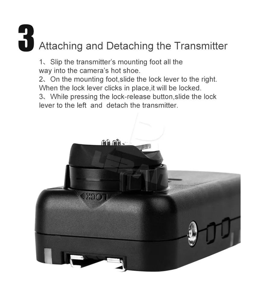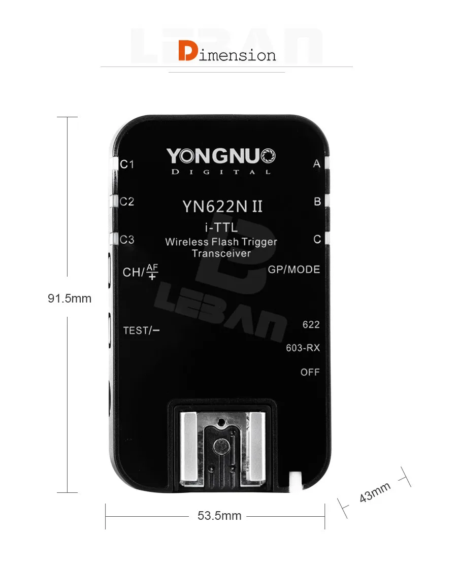 Он поддерживает Главный блок на комплекты передатчиков параметров каждой группы. Этот продукт является дизайном беспроводного трансивера, расстояние дистанционного управления достигает 100 м, поддерживает 7 беспроводных каналов и три группы a/B/C, а также с функцией AF assist beam эмиттера.