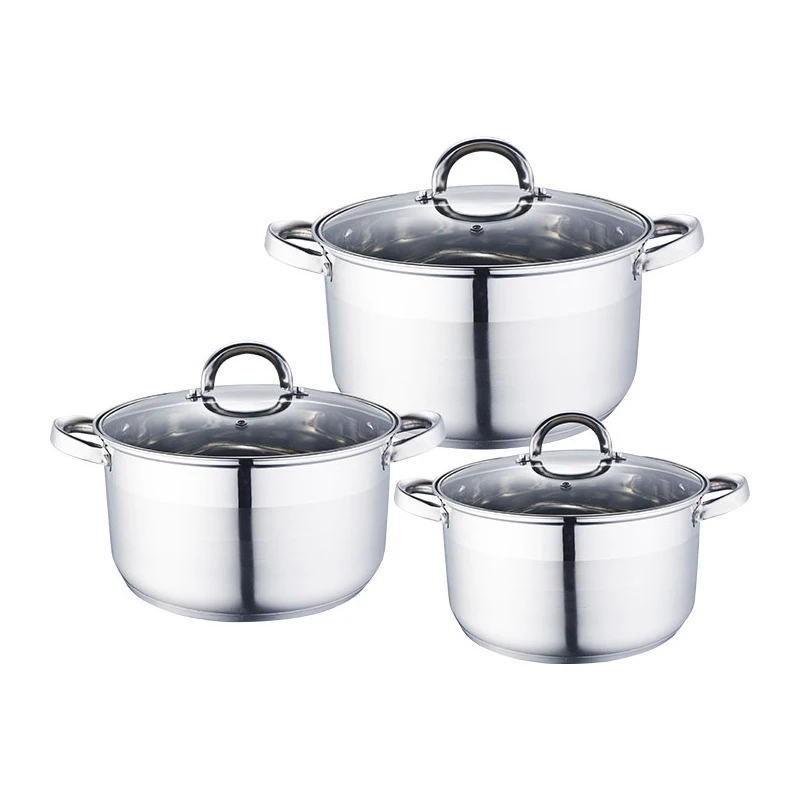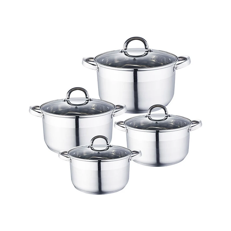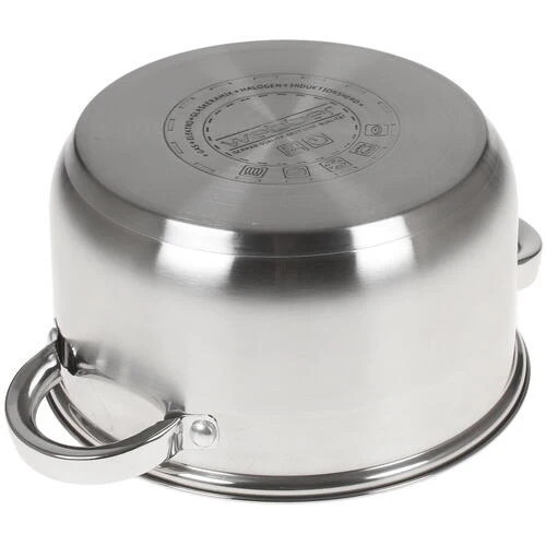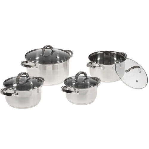 8 предметов: кастрюли с крышкой, объем 2, 2.8, 3.7 и 6.2 л. Выполнены из нержавеющей стали. Трехслойное дно с повышенной термоотдачей. Подходит для использования на всех типах плит, включая индукционные.