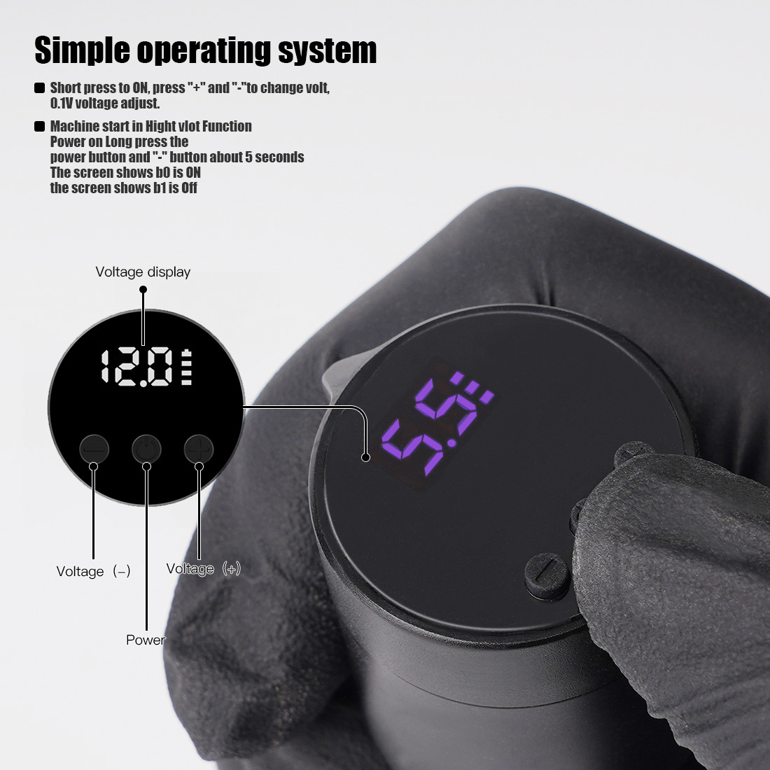 2, простая Операционная система: ненадолго зажмите кнопку включения, нажмите «+» и «-», чтобы изменить вольт, 0,1 V напряжение регулируется.