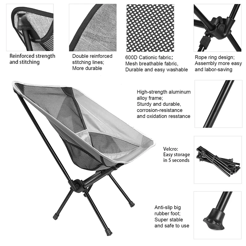Супер комфорт: уникальный и эргономичный дизайн стула для кемпинга дает вам лучший опыт сидения, позволяя вам расслабиться. Дышащая сетка для сиденья обеспечивает комфорт во время жаркого сезона.