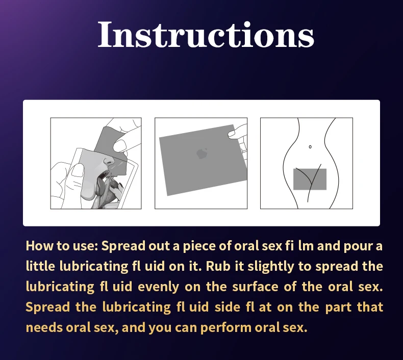 Разложите кусок оральной секс-пленки и Налейте на нее немного смазочной жидкости. Слегка натрите, чтобы равномерно распределить смазочную жидкость на поверхности орального секса. Разложите смазочную жидкость с плоской стороны на части, которая нуждается в оральном сексе, и вы можете выполнять оральный секс.