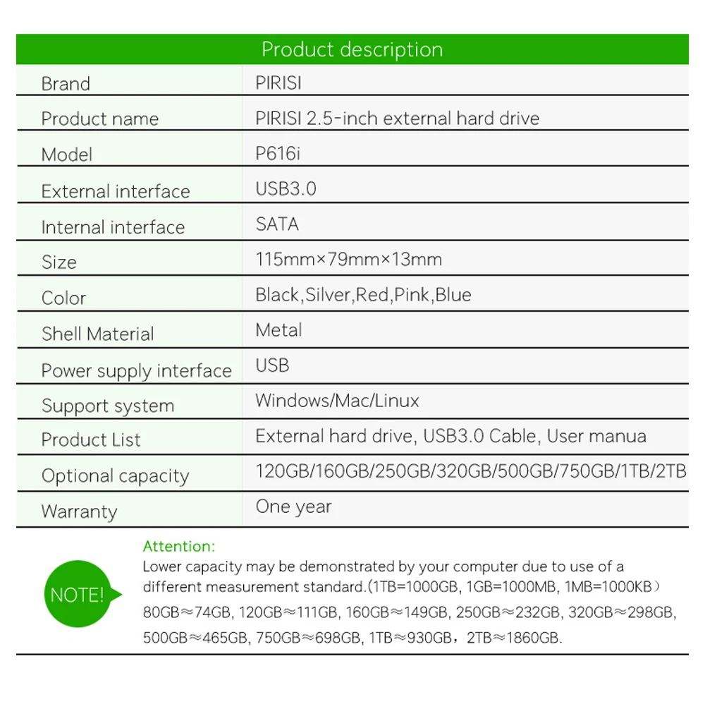 Портативный внешний жесткий диск PIRISI P616I SuperSpeed USB 3,0 2,5 для удобного копирования и защиты ваших ценных воспоминаний и работы. Компактный Защитный металлический корпус идеально сочетается с вашим ноутбуком. Аккуратно организовывайте и храните все ваши файлы, не беспокоясь о том, что у вас нет места, иногда дополнительное хранилище недостаточно, вам может потребоваться взять ваши файлы с собой, портативный внешний жесткий диск является идеальным решением.