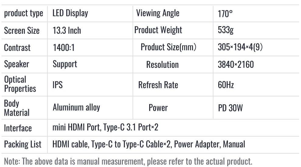 Отзывы о Портативный Ультратонкий игровой монитор IPS 13 3 дюйма 4K 3840*2160 HDR USB Type C HDMI экран