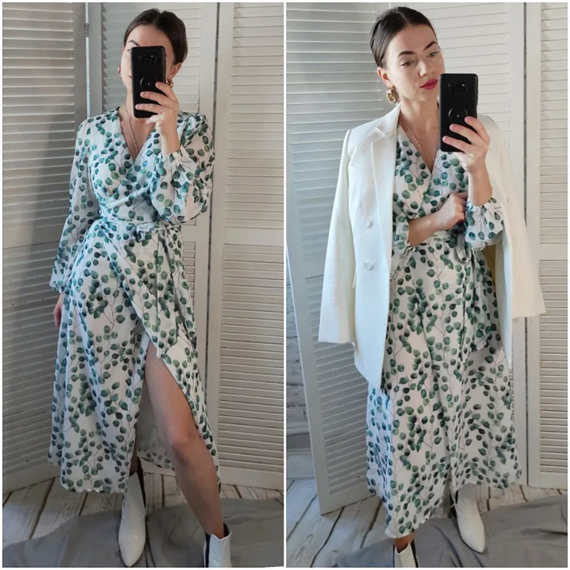 Отзывы о Женское платье с V-образным вырезом длинным рукавом и принтом листьев - купить по