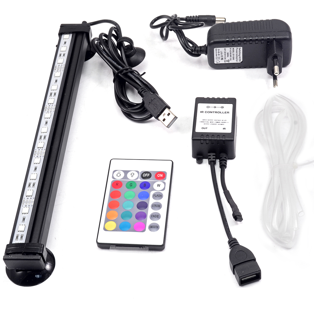 Поставляется с 24-кнопочным пультом дистанционного управления. Контроллер включает в себя 16 цветов/выцветание/затемнение и т. Д., которые создают красивый эффект в аквариуме.