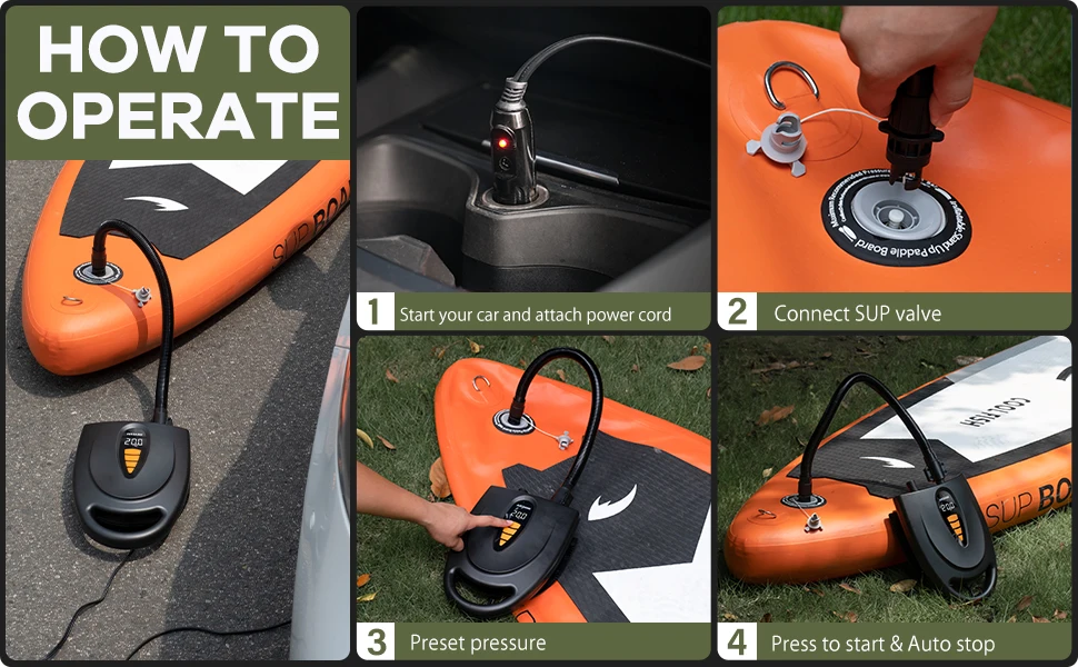 【Мощный, умный и автоматический ВЫКЛ】Это весло доска насос имеет автоматический двойной этап в надувании, первый этап для максимальнойСкорость при 350 л/мин и второй этап для максимального давления при 85 л/мин, Что делает большую часть времени и мощности. С функцией автоматического отключения насос SUP отключается при достижении целевого давления, что делает инфляцию безопасной и легкой.