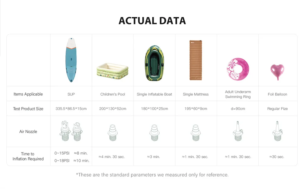 【20 PSI SUP насос】Максимальное давление до 20 фунтов на квадратный дюйм (1,38 бар), AIRBANK D7 быстро и легко заполняет ваши надувные лодки, такие как доска для весла, SUP, игрушки для бассейна и палатка. Это займёт всего лишь около 8 минут накачать 10,5 "SUP до 15 фунтов на квадратный дюйм, 10 мин до 18 фунтов на квадратный дюйм.