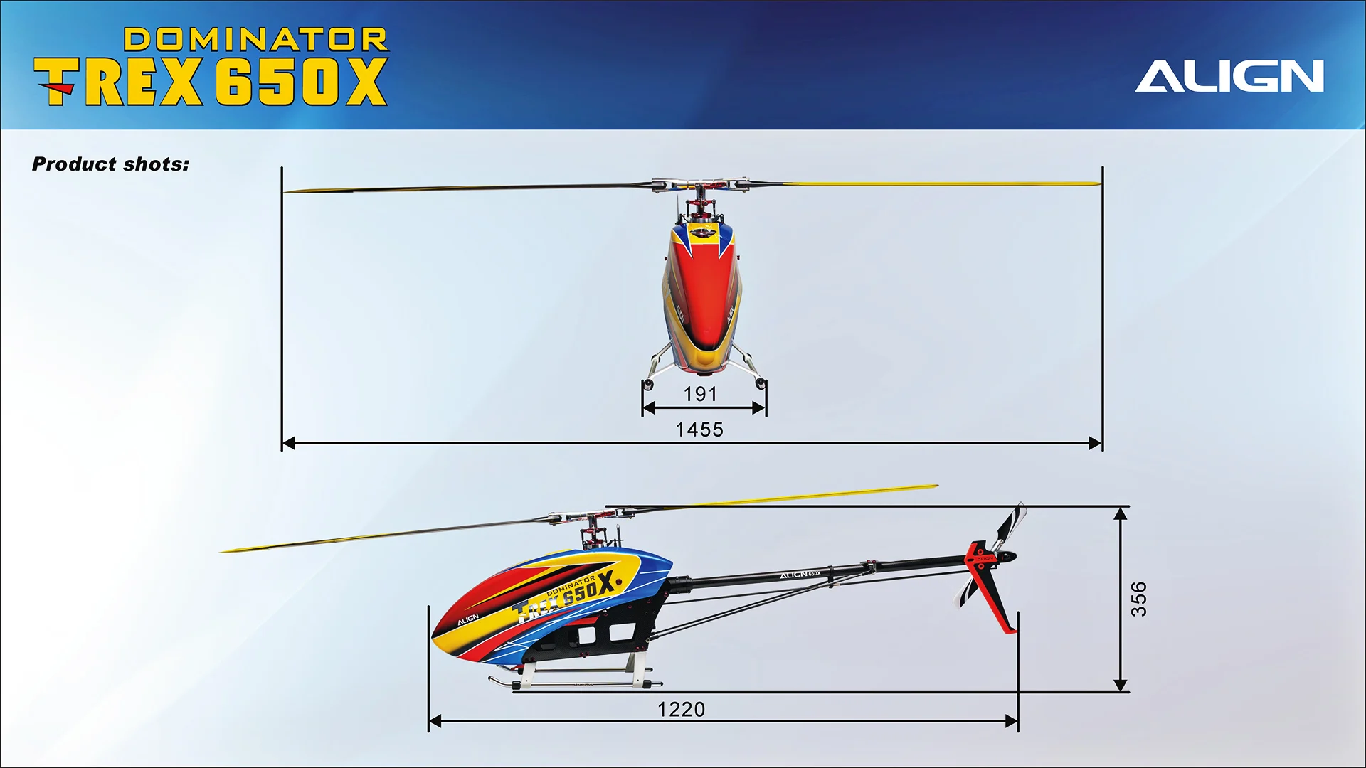 «T-REX 650X Dominator Super Combo»-это особый дизайн как для хобби, так и для 3D соревнований. Размер корпуса T-REX 650X составляет от T-REX до 600 вертолета класса T-REX. Он использует интегрированный композитный материал и технологию, которые эффективно увеличивают интенсивность конструкции и делают ремонт удобным. Верхняя узкая основная рама позволяет укрепить конструкцию, но также предотвращает деформацию, вибрацию и истирание шестерни при экстремальных полетах. Нижняя более широкая основная рамка имеет быстроразъемную защелку для аккумулятора, что делает сборку и разборку аккумулятора более удобными и безопасными. Бесформенная Головка ротора имеет низкую конструкцию CG, что лучше подходит для 3d-полета, что снижает сопротивление ветру, а также улучшает ощущение и стабильность полета. Так выровняйте T-REX 650X показывает отличные полетные характеристики как при агрессивном 3D полете, так и при медленном 3D полете F3C!
