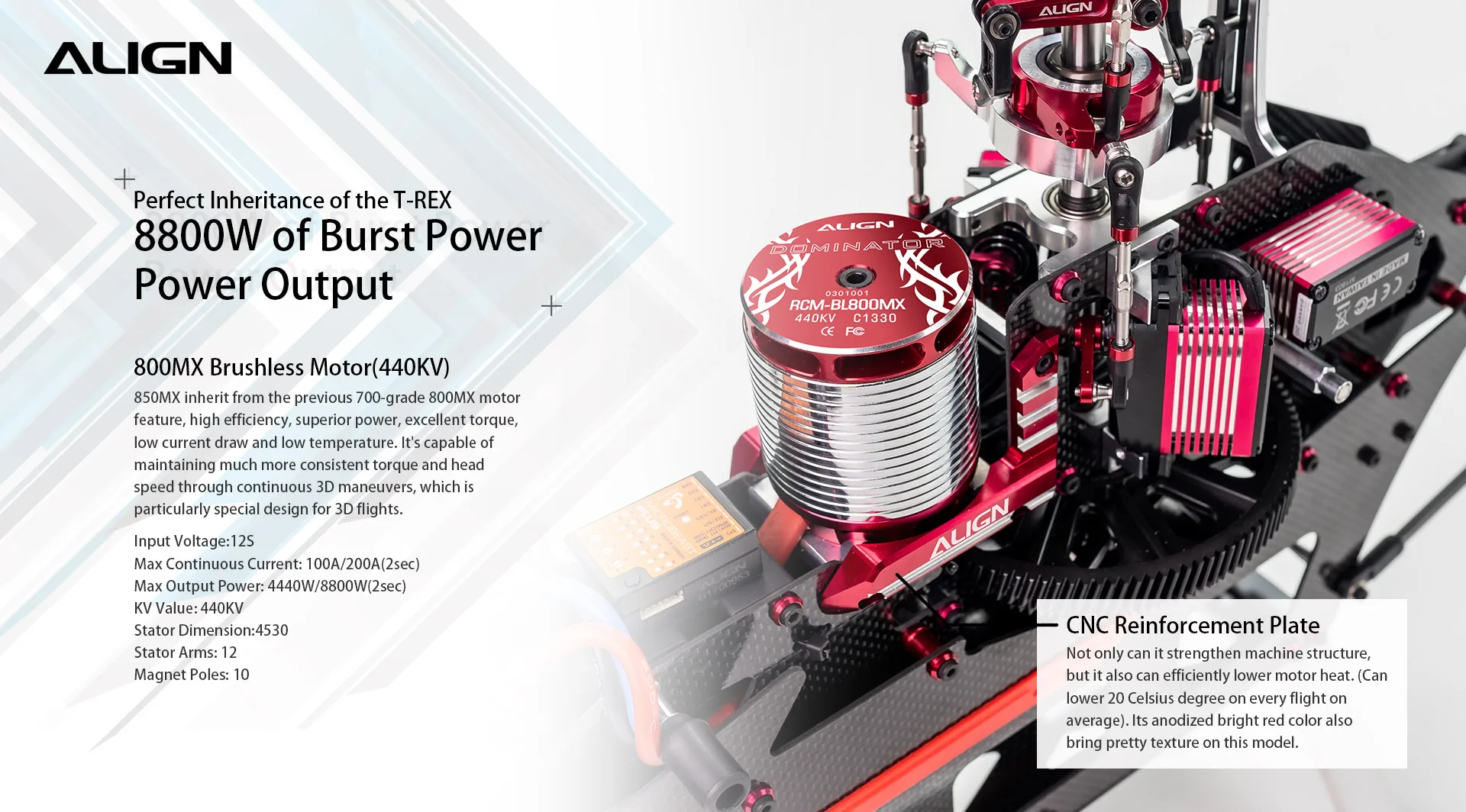 T-REX 650X оснащен двигателем ALIGN 800MX с отличным крутящим моментом и высокой эффективностью. Кроме того, армирующая пластина может не только укрепить структуру машины, но также может эффективно снизить нагрев двигателя до 20 °C на каждом полете в среднем. Бесщеточный ESC RCE-BL130A поддерживает Вход аккумулятора 12S 3000 ~ 6000 мАч. Пилоты могут выбрать Основные Лезвия от 600 до 650 мм в зависимости от их предпочтения для выдающихся летных характеристик.