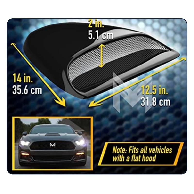Универсальная посадка-вентиляционное отверстие для автомобильного капота предназначено для любых размеров плоского капота автомобиля. Размеры: Длина = 14 дюймов (35,56 см), Ширина = 12,5 дюймов (31,75 см), высота = 2 дюйма (5,08 см). Пожалуйста, измерьте капюшон вашего автомобиля перед покупкой.