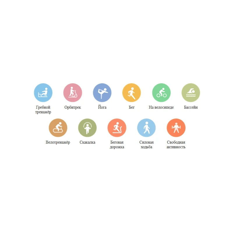 Поддерживаемые виды активности: бег, силовая ходьба, езда на велосипеде, беговая дорожка, плавание в бассейне, свободная активность,велотренажер, орбитрек, скакалка, йога, гребной тренажёр