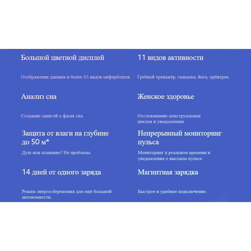 Дисплей 1,1" AMOLED, 126x294, глубина цвета 16 бит. Высокоточный 6-осевой датчик и PPG-датчик измерения пульса. Bluetooth 5.0 BLE. Защита от влаги 5 атм. Вибромотор. Аккумулятор 125 мА·ч, автономность and ge; 14 дней.