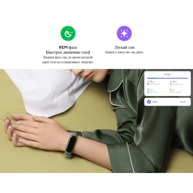 Контроль сна: создание записей о фазах сна (медленный сон, быстрый сон, REM-фаза (быстрое движение глаз), лёгкий сон)