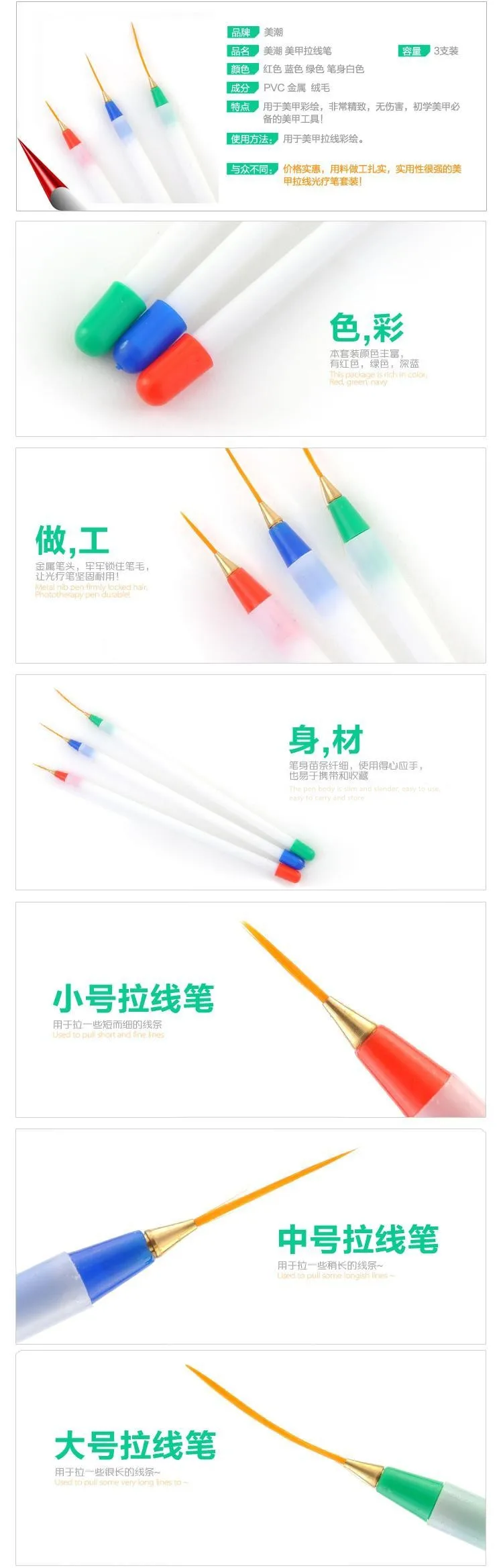 3 цвета, 3 шт., с белой ручкой, акриловые кисти для дизайна ногтей, ручка для рисования, дизайнерские кисти, ручка