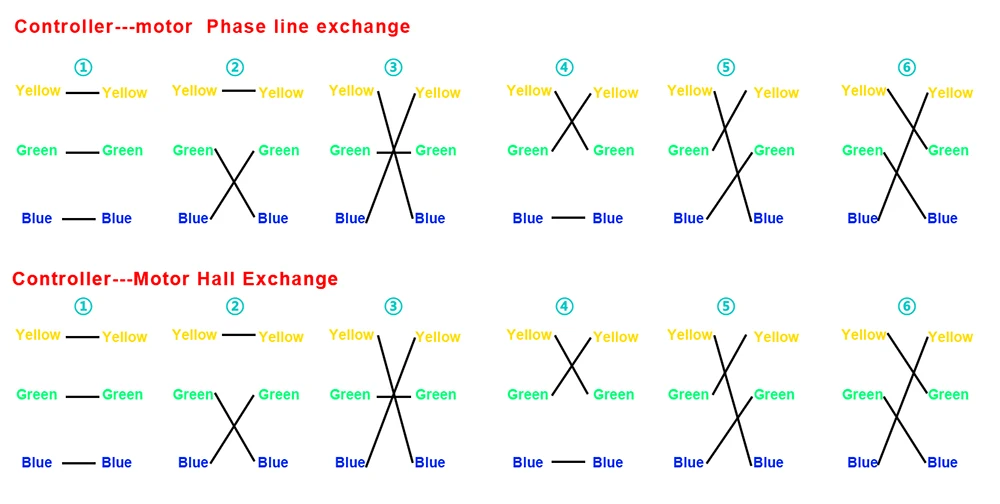 Примечание: Если двигатель перевернут, отрегулируйте его: сначала поменяйте две линии Холла контроллера (желтый, зеленый и синий) и настройте в соответствии с линией карты.