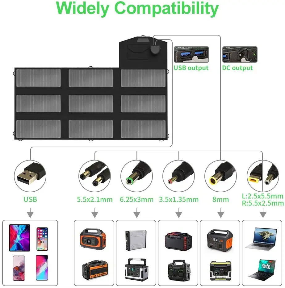 ☀️ 4-пряди для наращивания волос: двойной порт USB (5 В/2.4A порта, в том числе) с iSolar Технология для зарядки 5V Питание гаджеты, и 18V DC выход (18V/3A) для зарядки вашего ноутбука или автомобильного аккумулятора 12 В и портативного генератора, параллельный Соединительный порт для подключения нескольких складных солнечных панелей. (Примечание: вся солнечная панель мощностью не более 280 Вт)