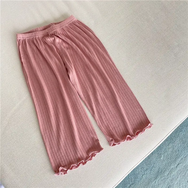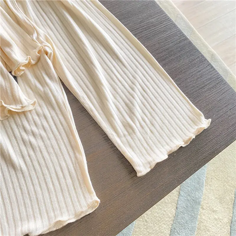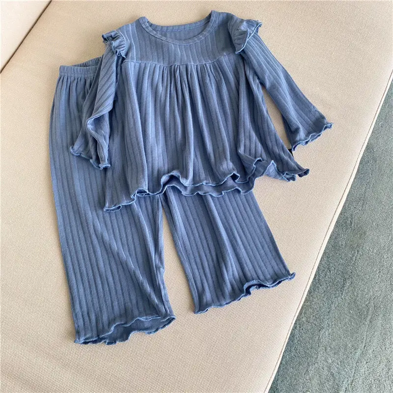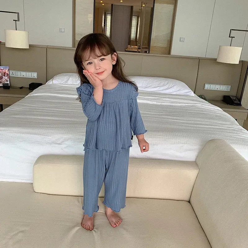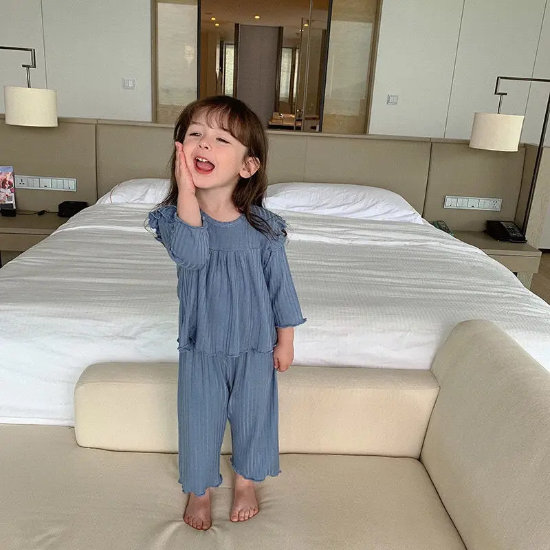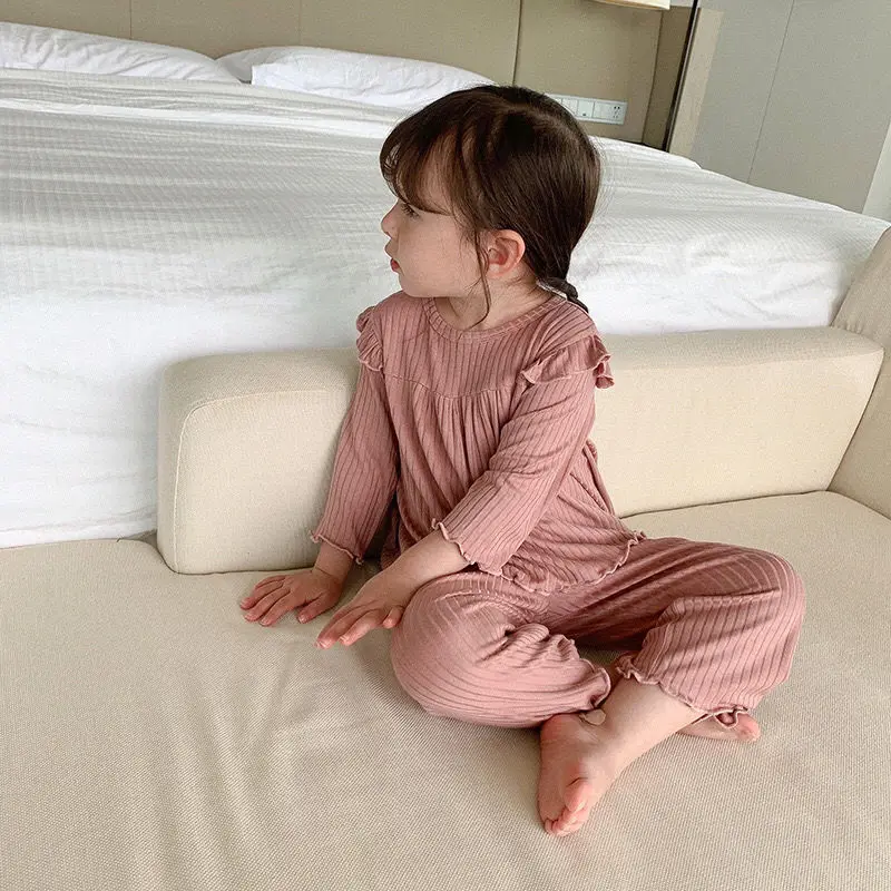 Милый пижамный комплект для маленьких девочек; Сезон весна-осень; Мягкий Свободный пуловер в рубчик с оборками; Комплект из двух предметов; Домашняя одежда; Одежда для малышей