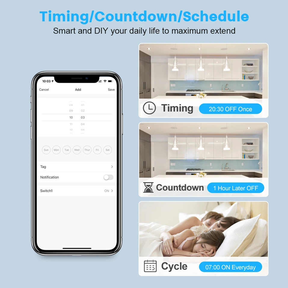 [Таймер, расписание и функция отсчета]-Вы можете создать расписание в соответствии с вашими личными требованиями, а также таймером, функцией отсчета, умным и DIY вашей повседневной жизни до максимального расширения.