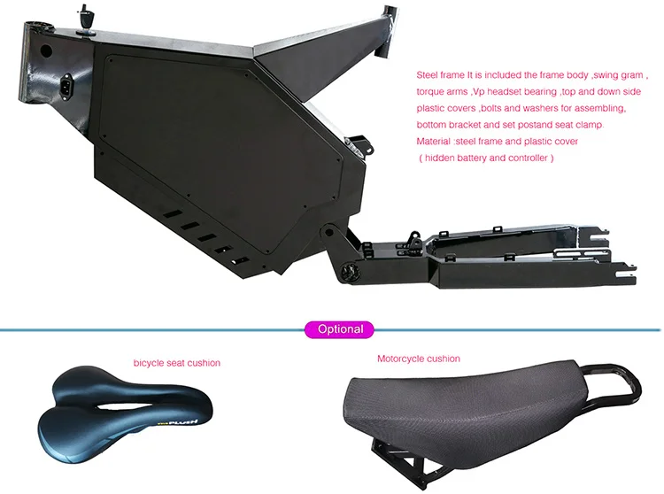 Стальная рама включает в себя корпус рамы, Свинг грамм, крутящий момент, Vp подшипник гарнитуры, сверху и вниз боковые пластиковые крышки, болтыИ шайбы для сборки, нижний кронштейн и установить зажим для сиденья postand. Материал: стальной каркас и пластиковая крышка (скрытая батарея и